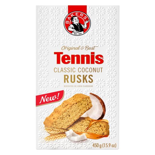 Rediscover a nostalgic treat with a delightful twist. The Bakers Tennis Classic Coconut Rusks are inspired by the beloved Bakers Tennis Biscuits, featuring a classic coconut flavour. Perfect for dipping, these rusks are baked to a satisfying crunch, ideal for pairing with your favourite tea or coffee.