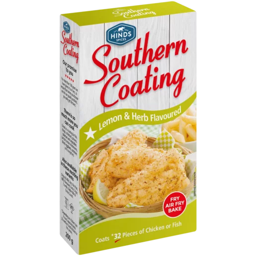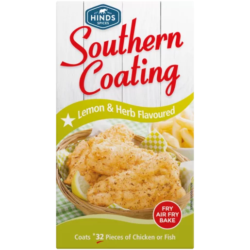 Spice up everyday cooking with Hinds Spices Lemon & Herb Flavoured Southern Coating. It offers a lemon and herb flavour designed for various cooking methods, including frying, air frying and baking, covering up to 32 pieces of chicken or fish in a crispy coating that makes your meals bolder. Suitable for chicken, fish, chops, prawns and calamari.