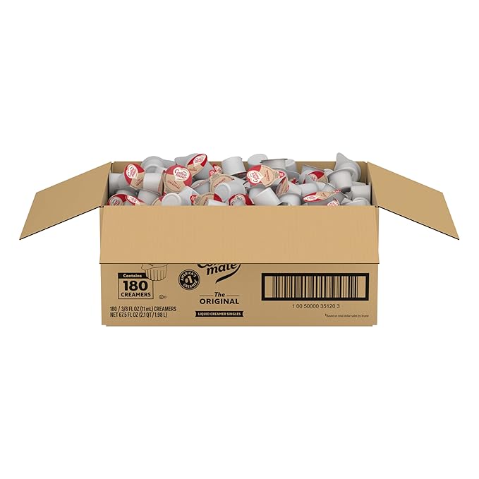 Nestle Coffee mate Original flavored liquid creamer singles are a classic favorite. Within each cup is a deliciously rich, velvety smooth creamer that will enhance and enrich your coffee offering with a touch of differentiation. Packaged in a 180-count box, these are the perfect solution for a delicious and convenient option to customize your favorite beverage. These creamer singles don’t need to be refrigerated and can retain their irresistible flavor at room temperature for up to 9 months. Easy to use - shake, open and pour. Non-Dairy + Lactose-Free + Cholesterol-Free + Gluten-Free + Kosher Dairy. Coffee mate is America's #1 coffee creamer. With a variety of flavors and formats, Coffee mate has your coffee creamer needs covered. Delight your employees, customers and guests by offering Coffee mate liquid creamer in your workplace, break room or kitchen.