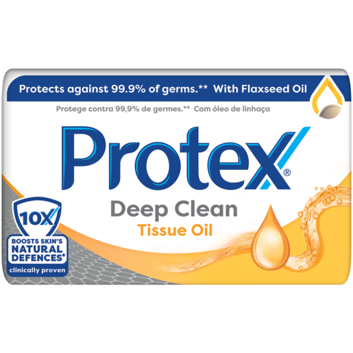 Protex Deep Clean Tissue Oil bar soap offers protection from within*. Its formula effectively helps to remove dirt and oil from your pores that can cause blackheads and pimples. Enriched with flaxseed oil, Protex’s breakthrough formula not only protects against 99% of germs** but, unlike other soaps, deposits on your skin’s surface and absorbs directly into it, boosting your skin’s defenses from within and offering 12-hour germ protection***. Now available in a NEW 175g size, Protex Deep Clean Tissue OIl bar soap is more than just a soap—it’s a game-changer for your skincare routine. Upgrade today and experience the unique protection that only Protex can offer! *Our Flaxseed Oil technology deposits & absorbs into your skin, to boost its natural defenses **Clinically proven ***After 2 weeks of twice daily use, maintains antigerm peptide vs same manufacturer’s bar soapFeatures