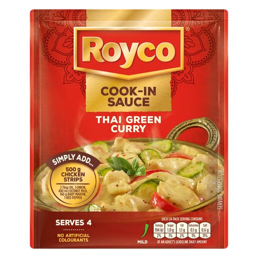 Add chicken, onion, baby marrow, coconut milk and red pepper to this mild Royco Thai Green Curry Cook-In Sauce for a delicious meal.